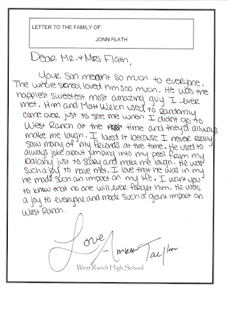 No family should have to go through the suffering you are experiencing. To have such a person leave this world is just horrible. Mr. Flath, ever since I got home, my family and I have been praying for you. There hasn't been a single day where I haven't thought about you guys. Jonn was one of the most caring, respectable, and Christian men I have ever met in my life. I only wish I got to know him more.